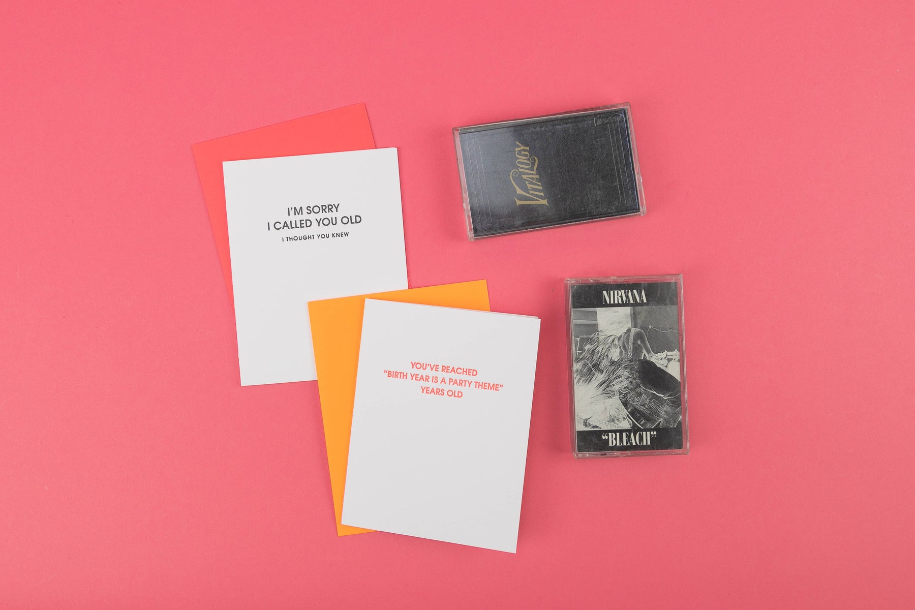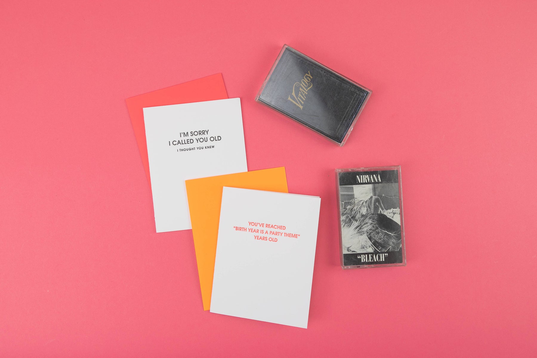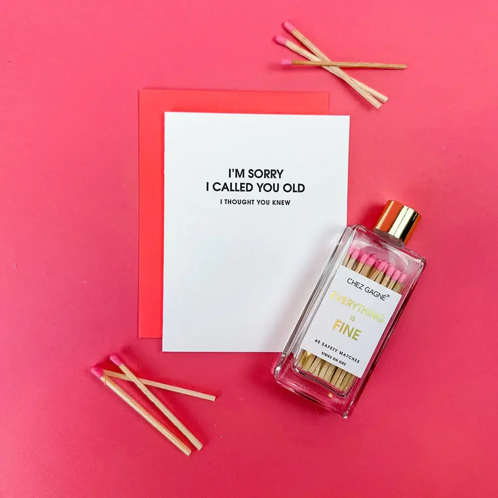 Our “I’m Sorry I Called You Old, I Thought You Knew” card is letterpress printed on a vintage printing press in sunny California. A playful black ink design on bright white tree free paper, paired with a bold red envelope, makes this the perfect cheeky birthday card.