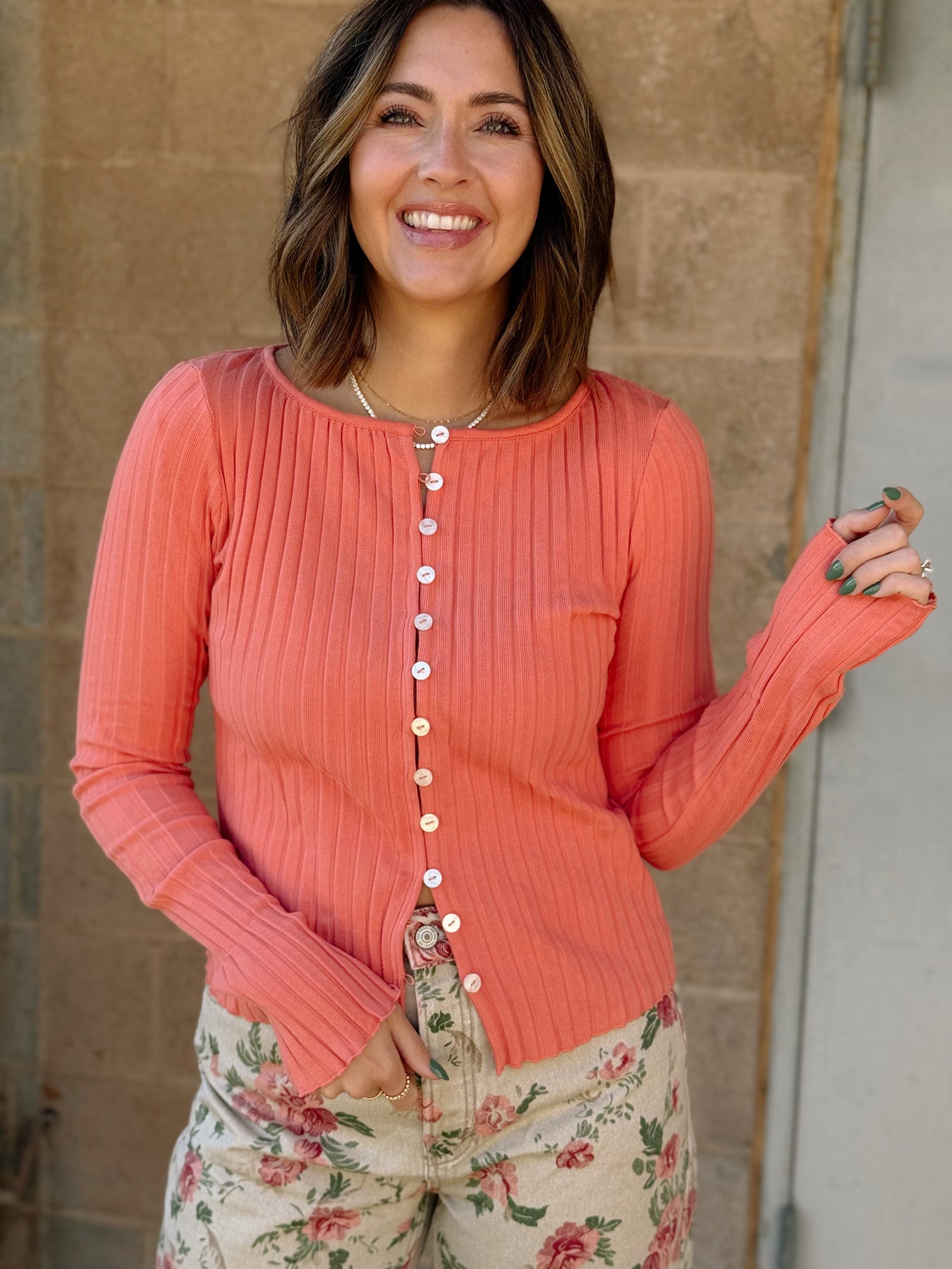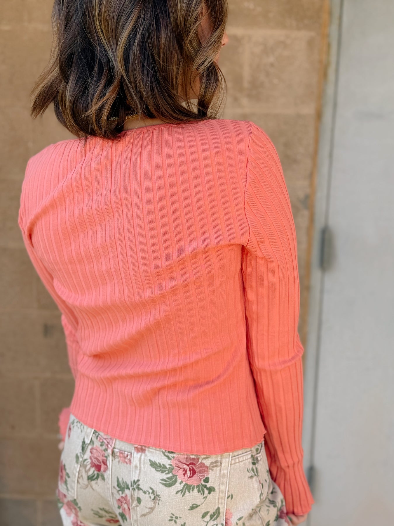 This playful long-sleeve top in a vibrant crabapple hue combines timeless ribbed fabric with a slim fit that flatters every curve. Featuring charming button closures, it’s the perfect mix of cozy and cute for any occasion.