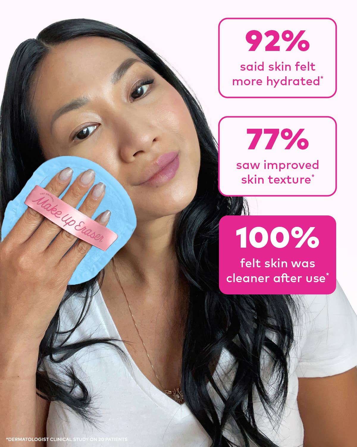 Erase all makeup with JUST WATER™ including waterproof. Our patented, water-activated makeup remover uses cloud-soft fibers to gently & easily remove all cosmetics & sunscreen from pores. 2 in 1 benefit: one side removes makeup & one side exfoliates.