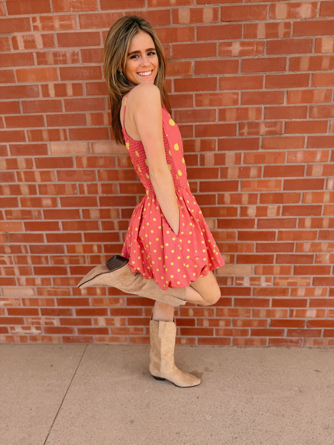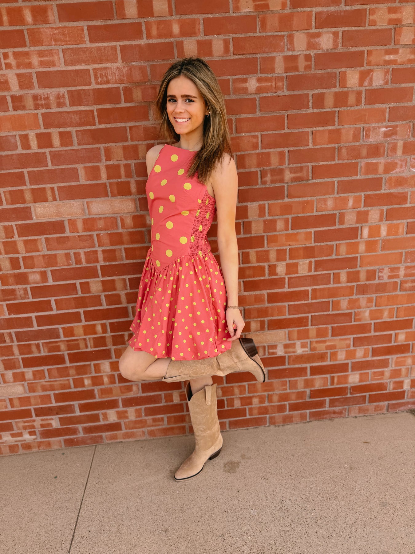 The Free People Misty Mini in Red Combo is a charming woven dress crafted from 100% cotton with a coordinating cotton lining for comfort and structure. Featuring delicate smocking details and a playful polka dot pattern, this mini dress effortlessly blends vintage-inspired elegance with contemporary style. Perfect for casual outings or dressed up for evening occasions, the tea-toned colorway adds warmth and versatility to your wardrobe. A timeless piece that transitions seamlessly from season to season.