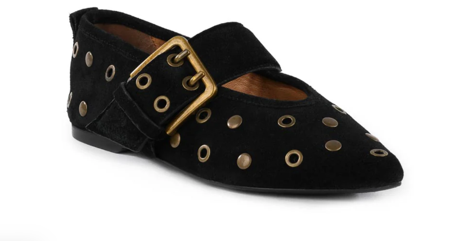 Mary Janes with an edge — these stylish suede flats feature a dramatic pointed toe and antiqued brass hardware forming a unique stud pattern. A wide buckle strap is finished with metal grommets, for a polished look that adds instant glam with no extra effort.