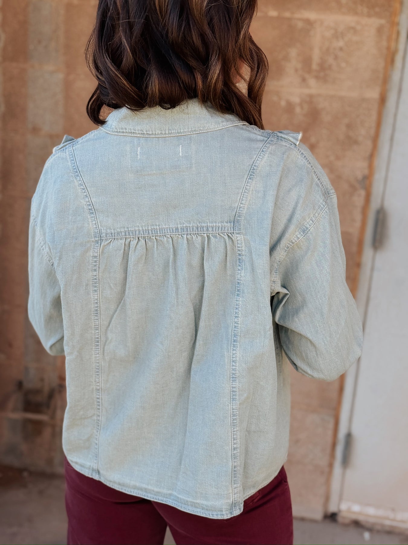 Add a touch of playful charm to your wardrobe with this oversized chambray button-down from We The Free. Featuring ruffled details and pintucked accents, it brings a fun, feminine vibe to a classic vintage tint wash. The collared neckline and button-front closure keep it cool and casual, while dropped shoulders add an easy, relaxed fit perfect for everyday style.