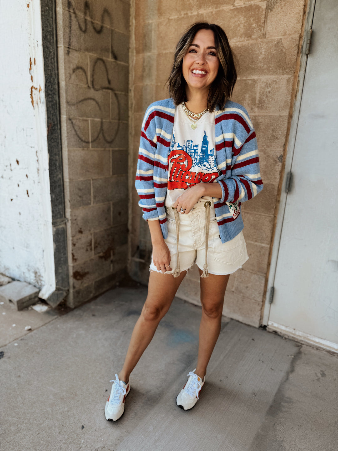 Daydreamer | Stripe V-Neck Slouch Cardigan- Blue/Red Cream