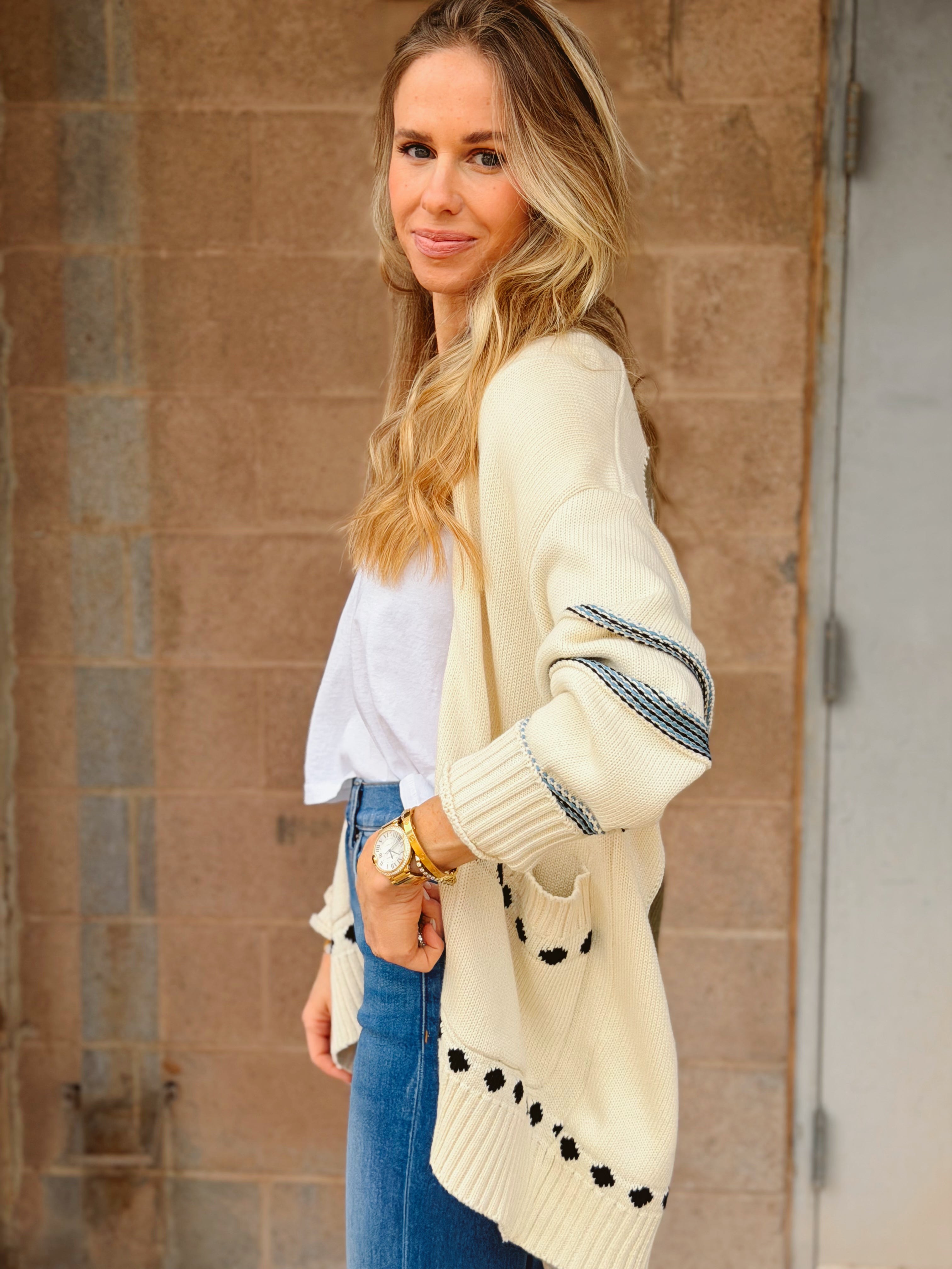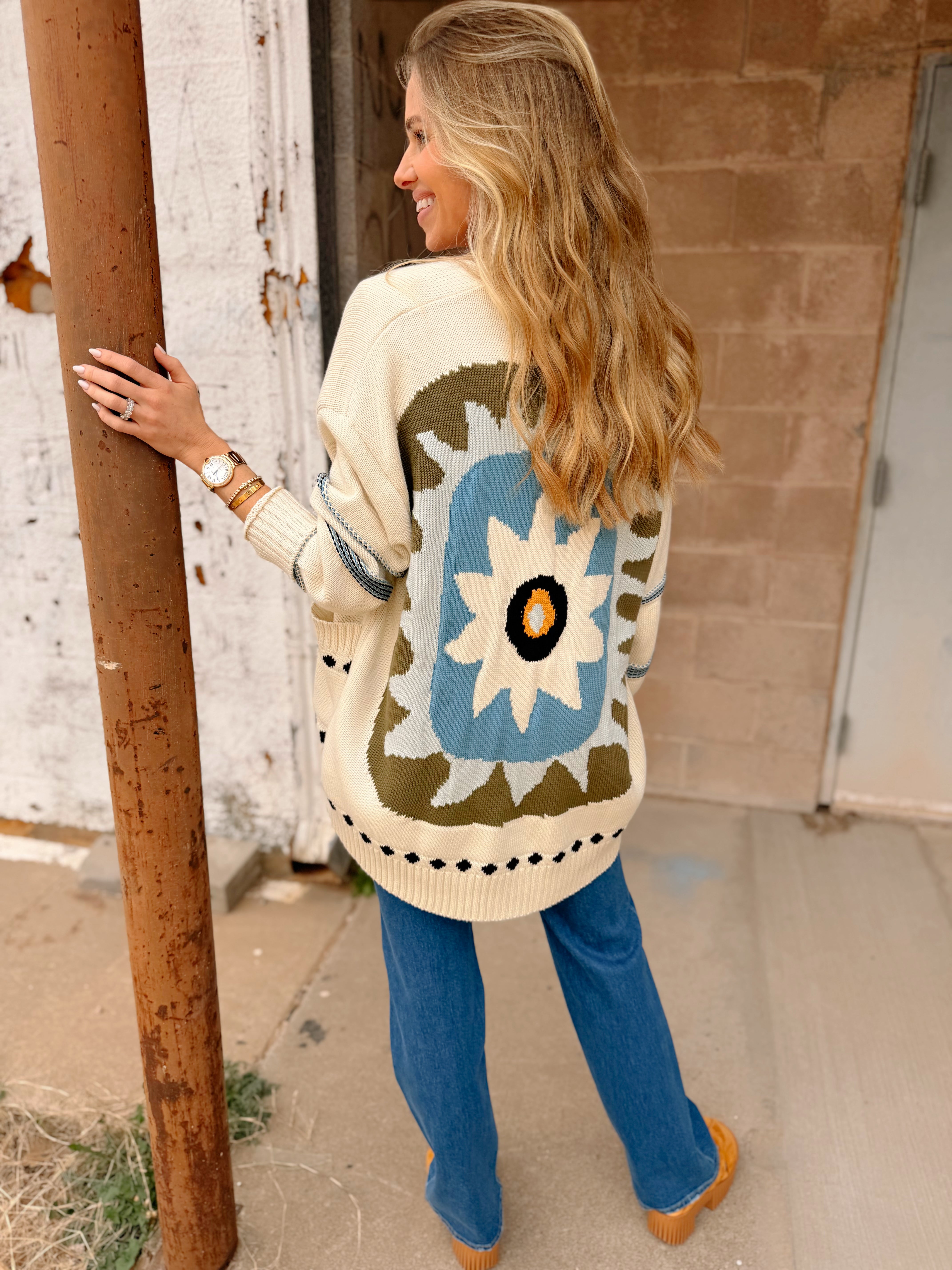 The Rumer Sweater is a statement-making, oversized cardigan crafted from 100% GOTS-certified organic cotton yarn. Designed for effortless layering, this throw-on silhouette features thoughtful rib detailing and a relaxed fit that drapes beautifully. The standout element lies in the bold artwork showcased on the back—a vibrant, artisan-inspired motif that brings personality and charm to the piece. Cozy, breathable, and undeniably eye-catching, the Rumer Sweater is the perfect blend of comfort and artistry.