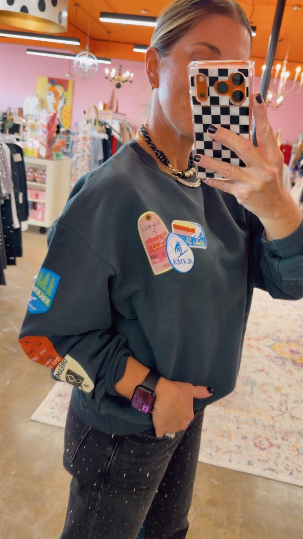 A collection of ski passes land in puff ink patches along our Oversized Crew Sweatshirt fit for the avid skier.