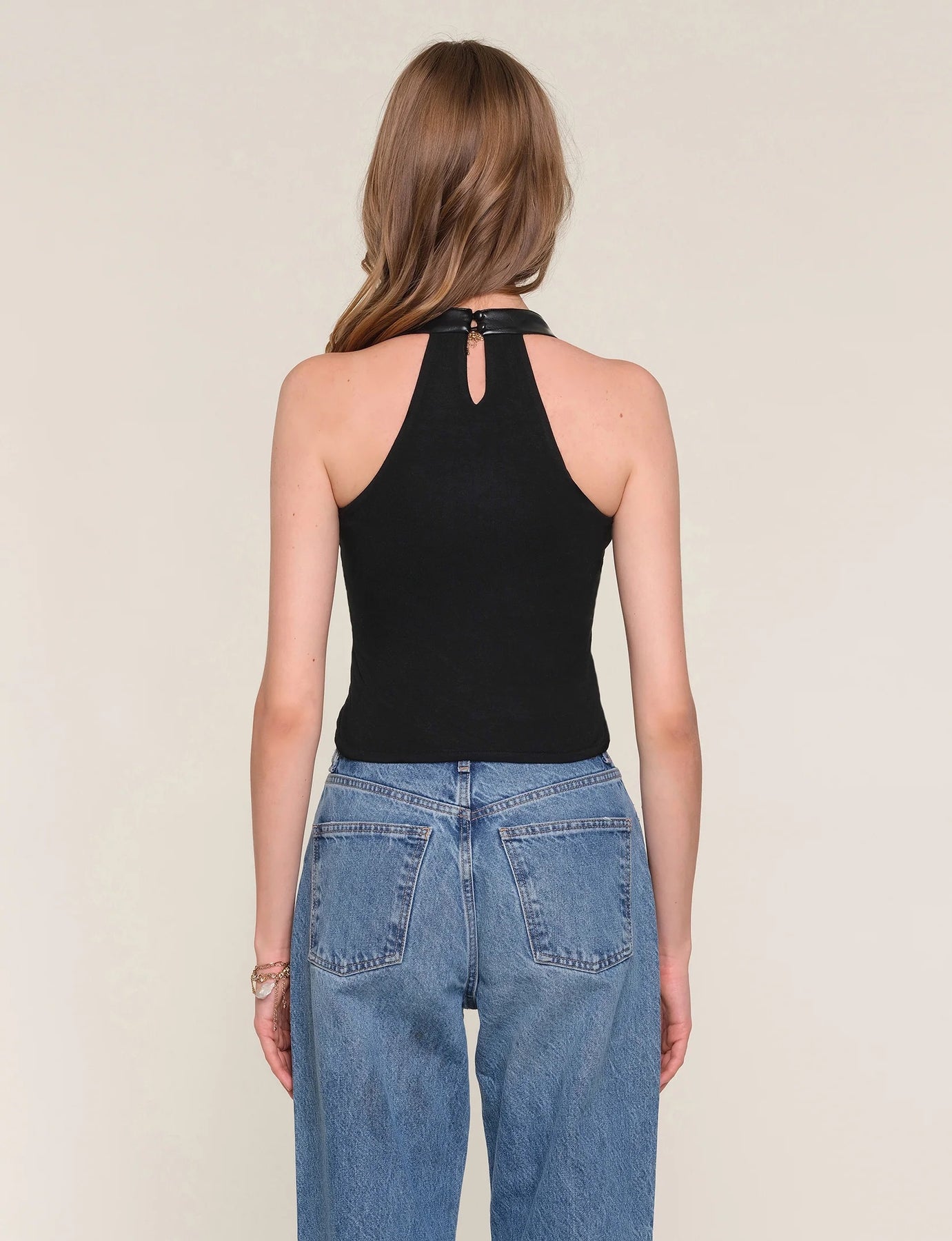 The Coleen Top is a faux leather halter top. It features a knit back panel for the most flattering fit.