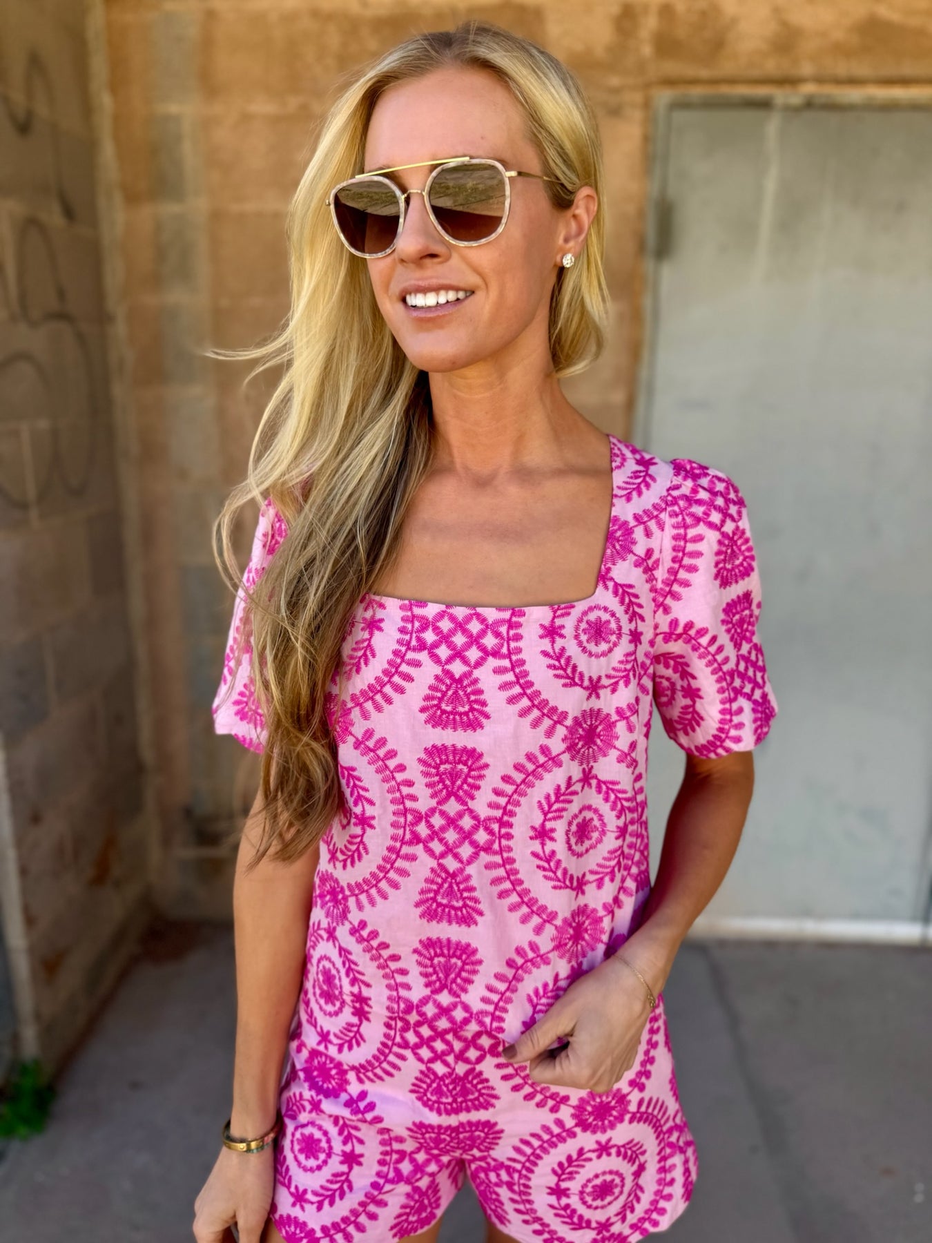 There’s something about a feminine top with thoughtful detail that instantly makes you feel pretty — even on the busiest days. The Adelyn Rae Hadley Square Neck Embroidery Scallop Top in Lilac/Magenta is one of those pieces that feels special the second you put it on. The square neckline frames the collarbone beautifully while the embroidered detailing and scalloped edges add softness and charm. Made from 100% cotton, it’s breathable and lightweight, giving you structure without heaviness — perfect for warm days when you still want to look polished. Designed to pair perfectly with the matching shorts for a coordinated set moment, it also looks just as good styled back to your favorite high-rise denim for a more casual, everyday feel.