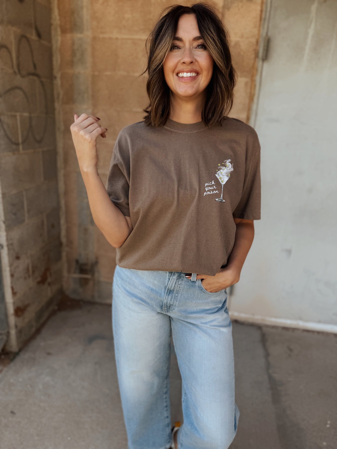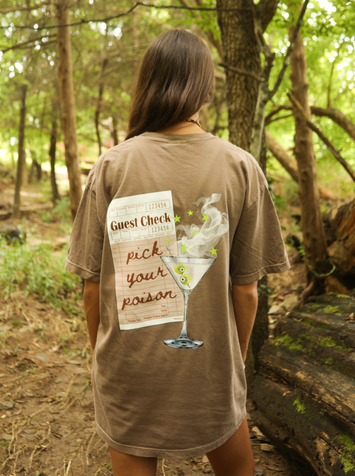 Pick your poison baby! This brown Comfort Colors tee features a smoking martini on the front chest and an oversized guest check and matching martini on the back. We love the eyeballs in place of olives.