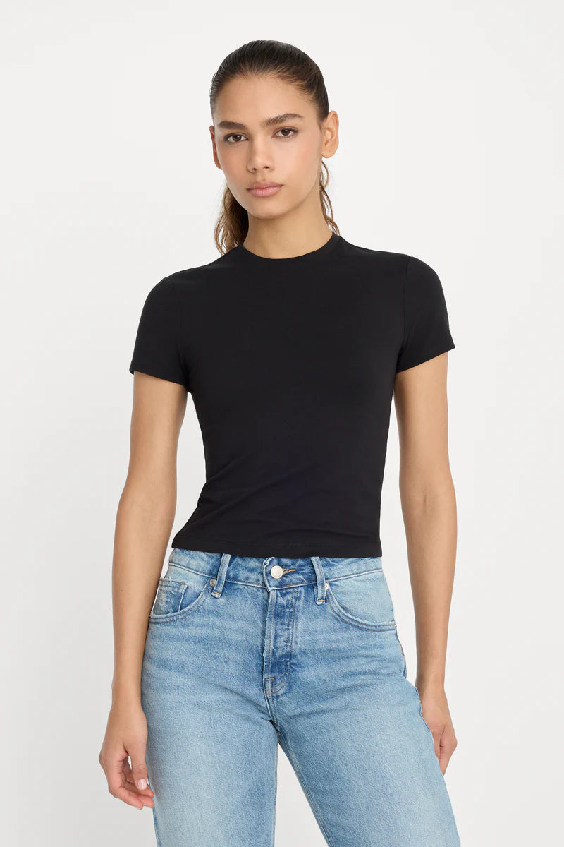 There’s something about a perfectly fitted tee that makes getting dressed feel easy again. The Good American Super Stretch Baby Tee is that wear-on-repeat essential — soft, flattering, and designed to hug in all the right places without feeling tight. Made from a breathable blend of 94% cotton and 6% spandex, it has that comfortable, broken-in feel with just enough stretch to move with you. The shorter, modern length makes it ideal for pairing with high-rise denim, giving you a clean, streamlined silhouette that feels current but still completely wearable for real life. It’s simple, versatile, and exactly the kind of piece that makes your closet work harder.
