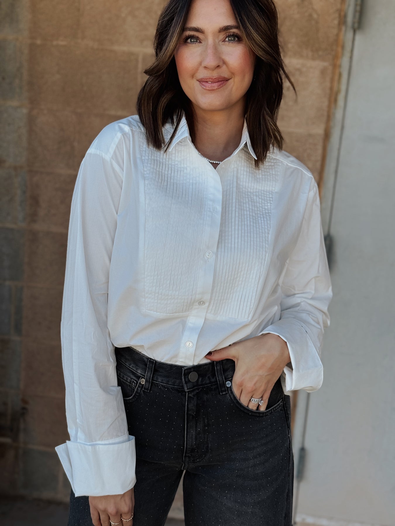 Elevate your formal wardrobe with the Sanctuary New Era Tuxedo Shirt in crisp white. Crafted from smooth poplin, it features a refined spread collar and elegant accordion pleat detailing at the front for timeless sophistication. The double button cuffs and classic button-front closure ensure a polished finish, while the relaxed fit offers comfort without sacrificing style. Perfect for special occasions, this shirt blends traditional tuxedo elements with modern ease.