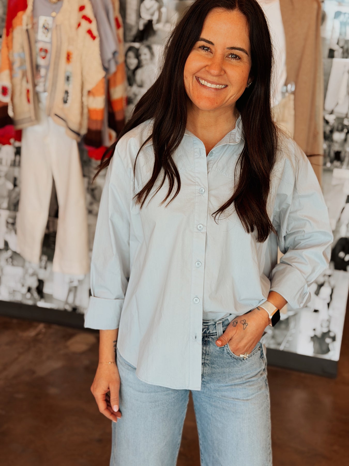 Indulge in the luxurious sophistication of Sundays' Adora Shirt in Mist. This full length, button front shirt features a classic collared neckline and long sleeves, elevating any outfit with its elegant and refined style. Ideal for any occasion, this shirt is a must-have for the fashion-forward individual.