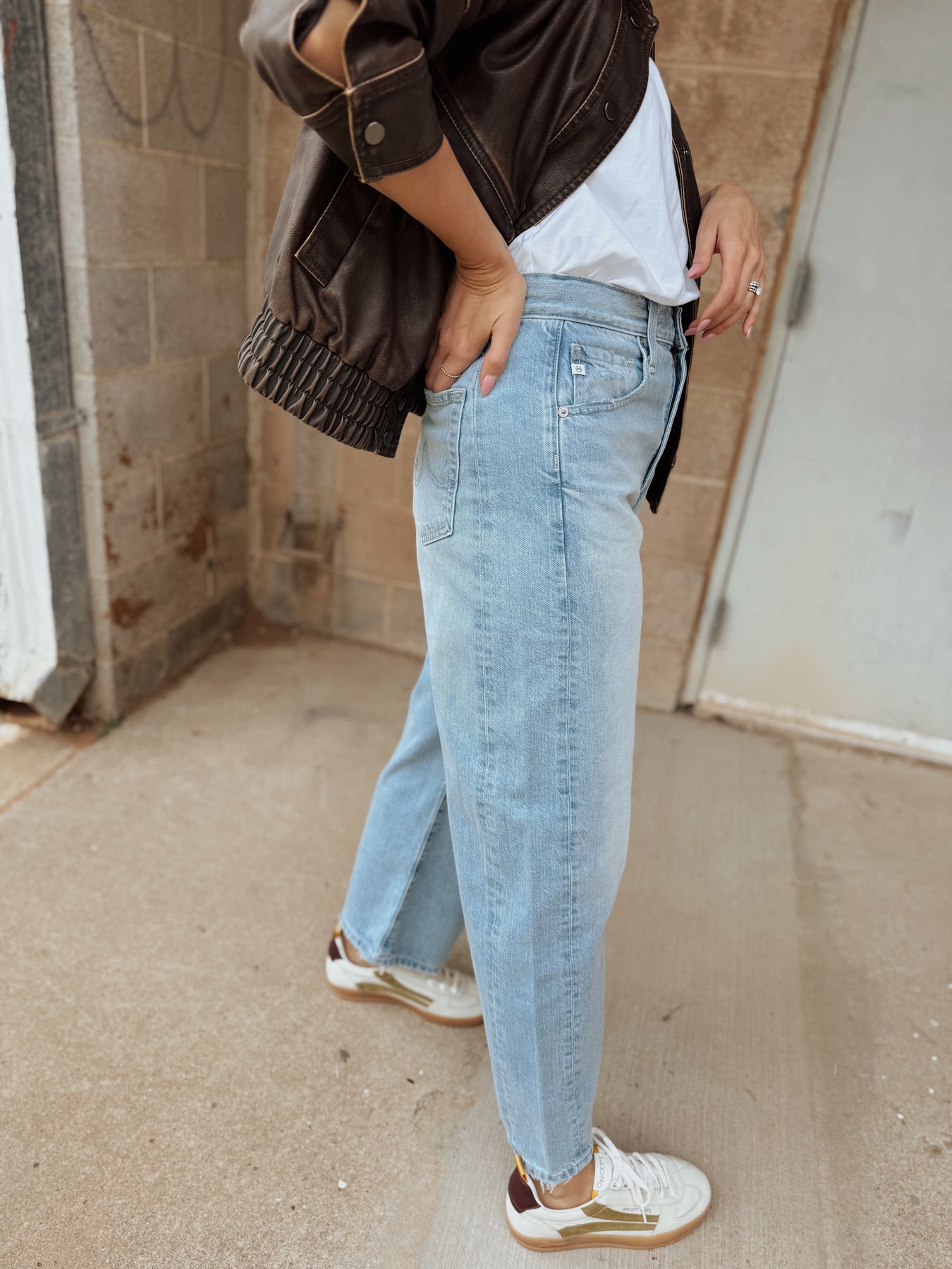 The AG® Jeans Hattie High-Rise Barrel in Allusion Destructed features an arched shape through the leg, accentuated forward side seam paneling that hits at the ankle for a modern proportion. It features belt loop waistband, zip-fly, button closure, tapered fit, and high-rise silhouette.