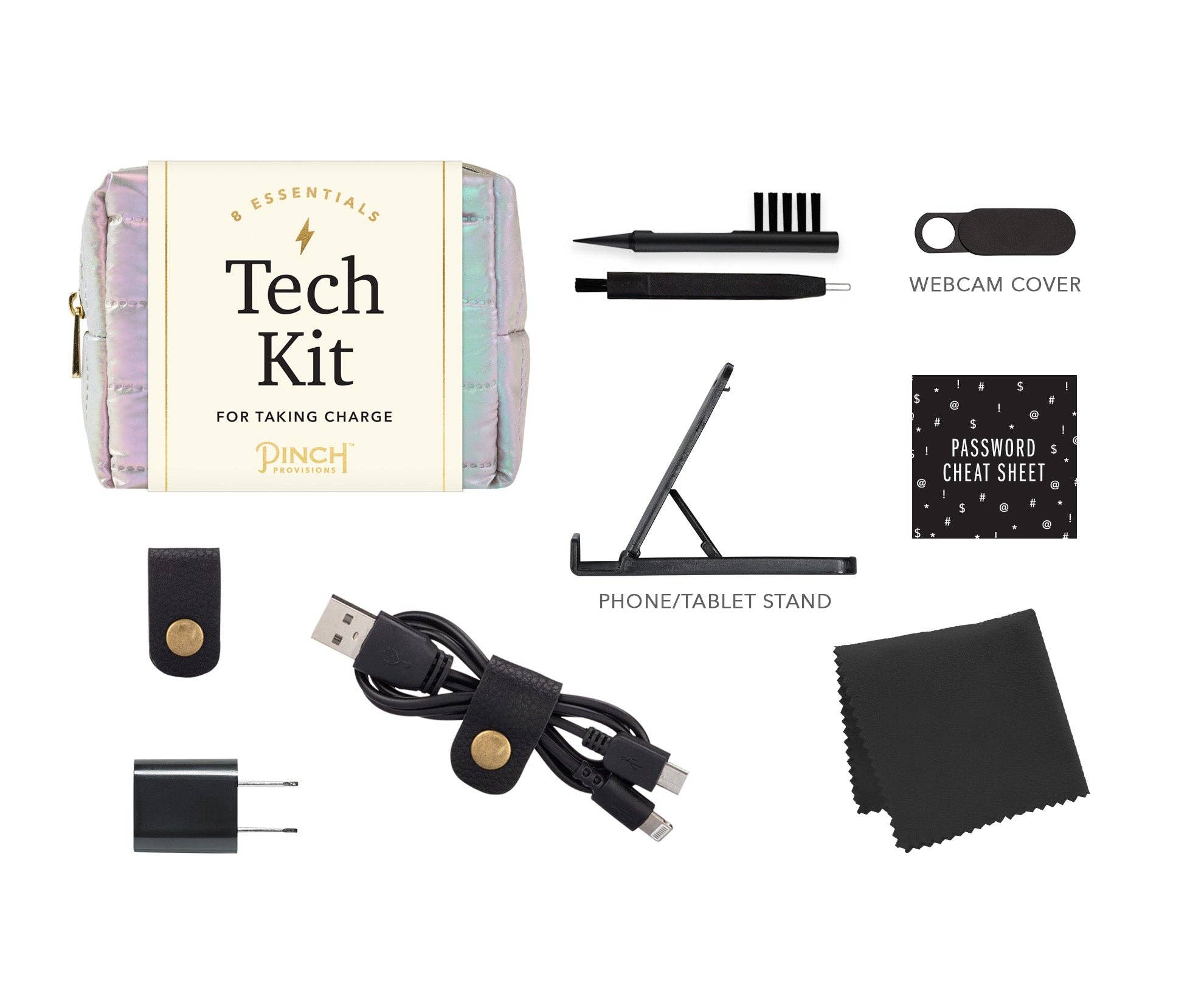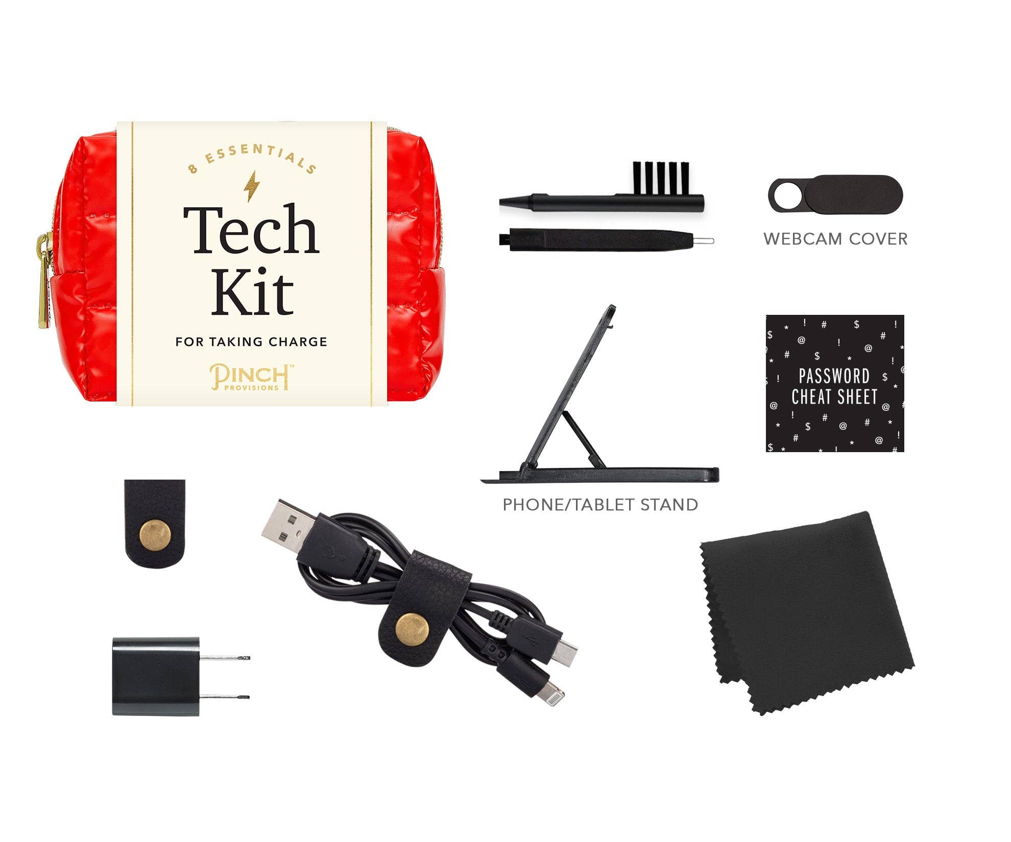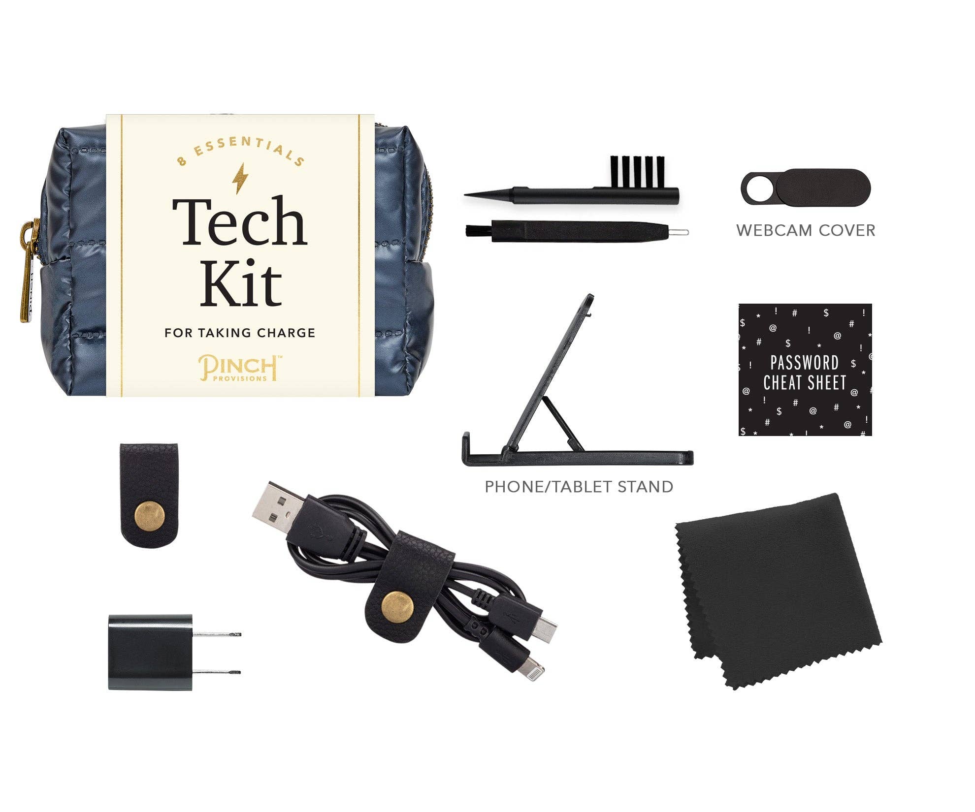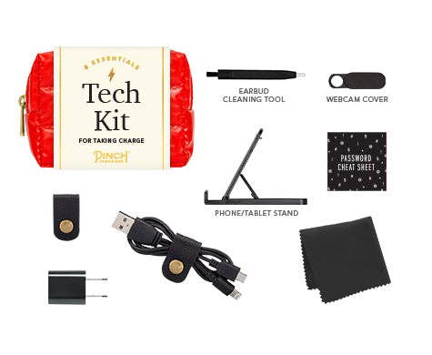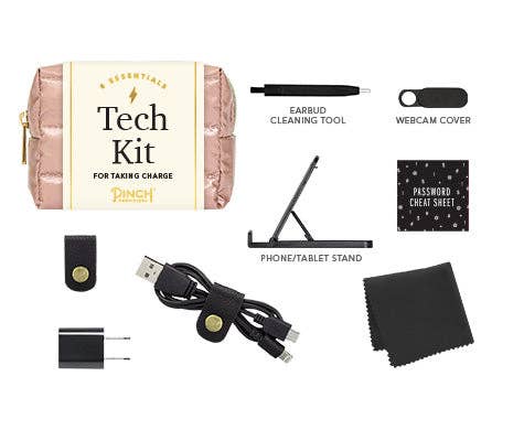 Take charge with the Puffer Tech Kit by Pinch Provisions with 8 emergency essentials. Keep your favorite tech essentials together, and neatly organized, in sporty puffer pouch. Kit includes a webcam cover, earbud cleaning tool, screen cloth, password hint list, cord organizer, phone/tablet stand, 2-in-1 charging cable and USB wall charger. holiday gift, stocking stuffer, office, stationary, charging, iphone, android, apple, windows, computers, laptop accessories, puffer, corporate, pouch, zipper bag, tech accessories, tech products, tech organizer, trendy, novelty, gifting, technology, gadgets, winter trends.