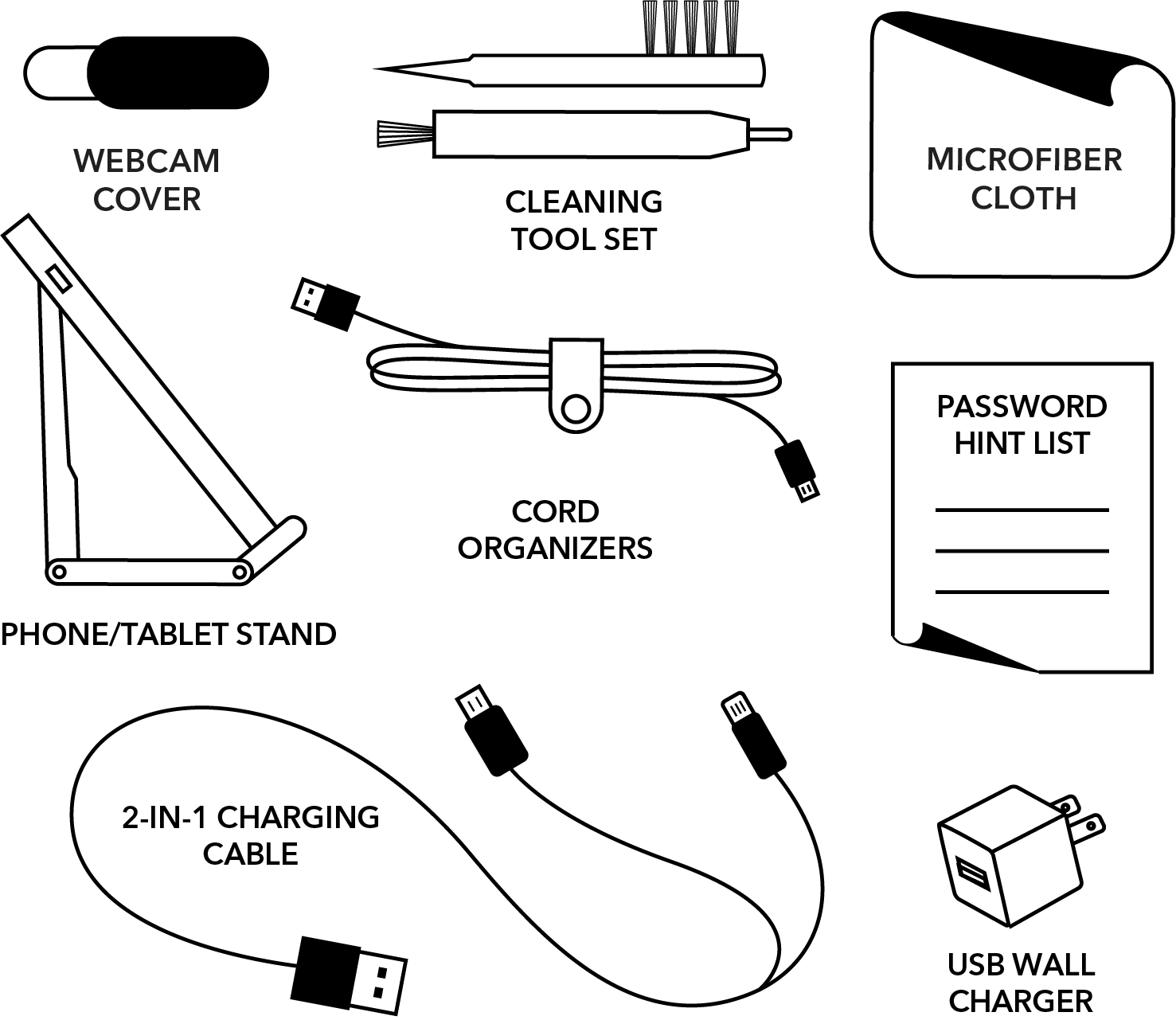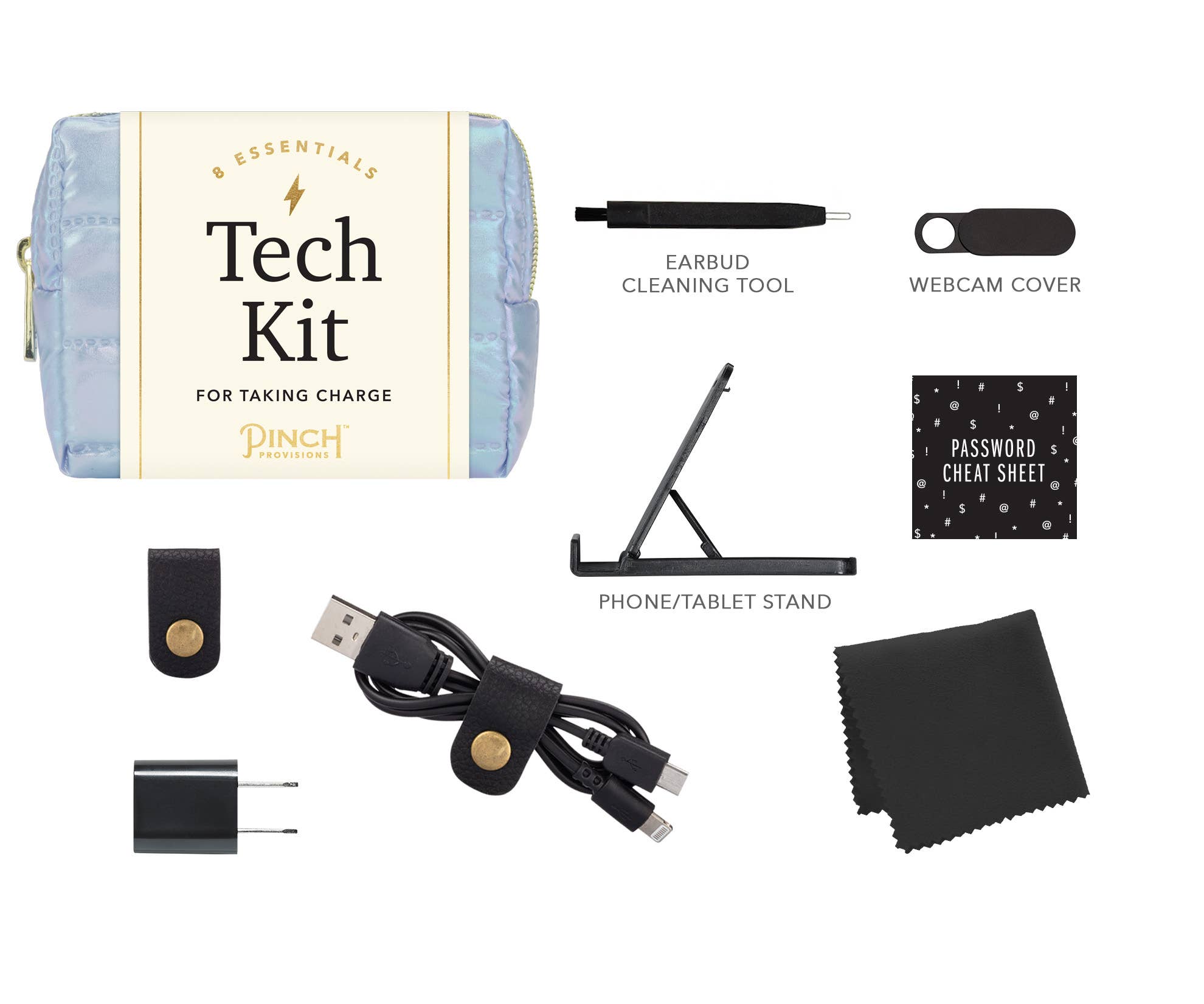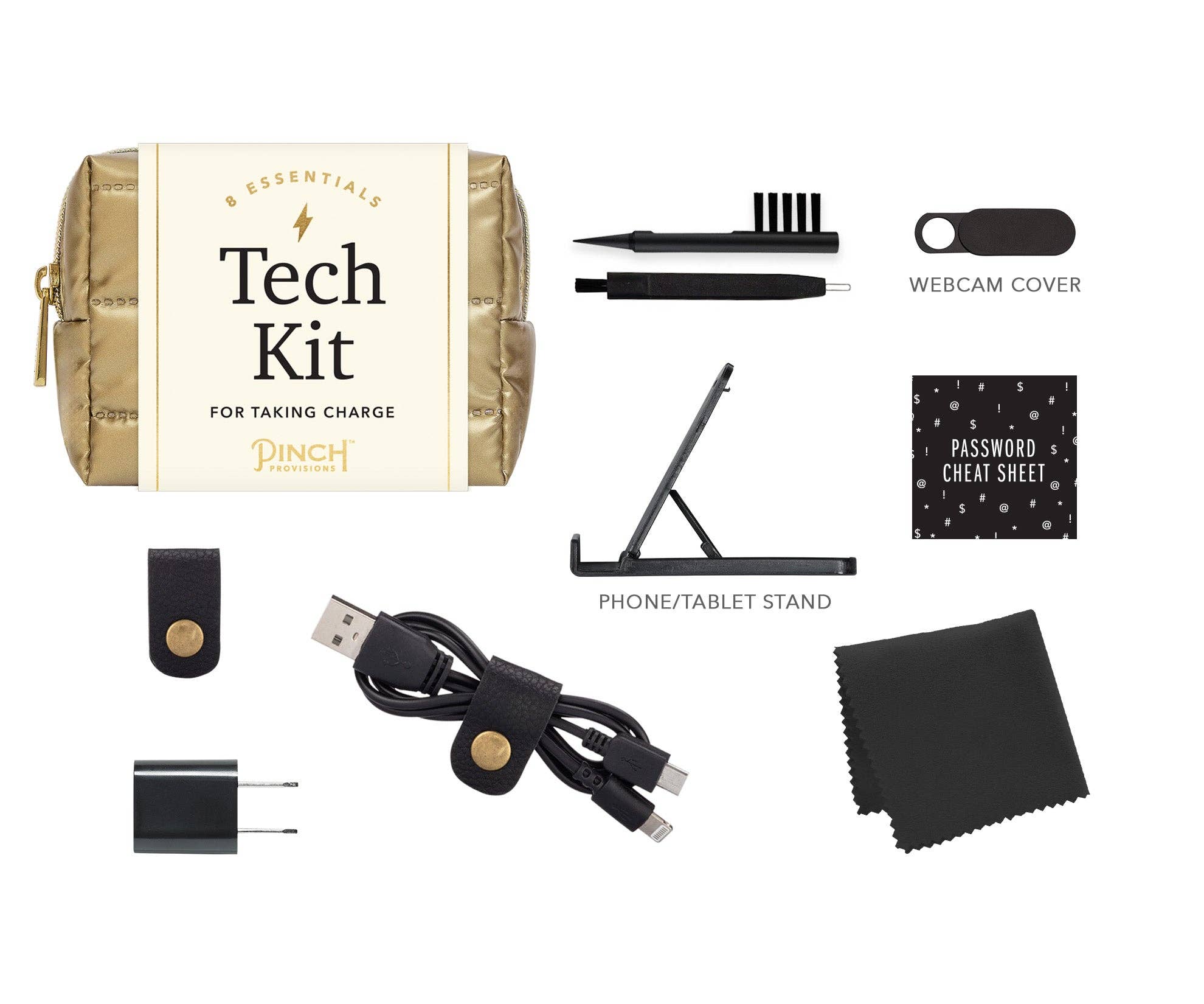 Take charge with the Puffer Tech Kit by Pinch Provisions with 8 emergency essentials. Keep your favorite tech essentials together, and neatly organized, in sporty puffer pouch. Kit includes a webcam cover, earbud cleaning tool, screen cloth, password hint list, cord organizer, phone/tablet stand, 2-in-1 charging cable and USB wall charger. holiday gift, stocking stuffer, office, stationary, charging, iphone, android, apple, windows, computers, laptop accessories, puffer, corporate, pouch, zipper bag, tech accessories, tech products, tech organizer, trendy, novelty, gifting, technology, gadgets, winter trends.